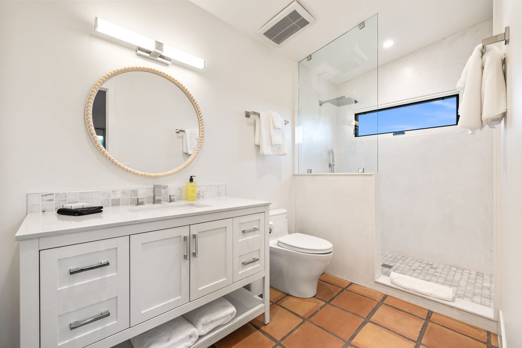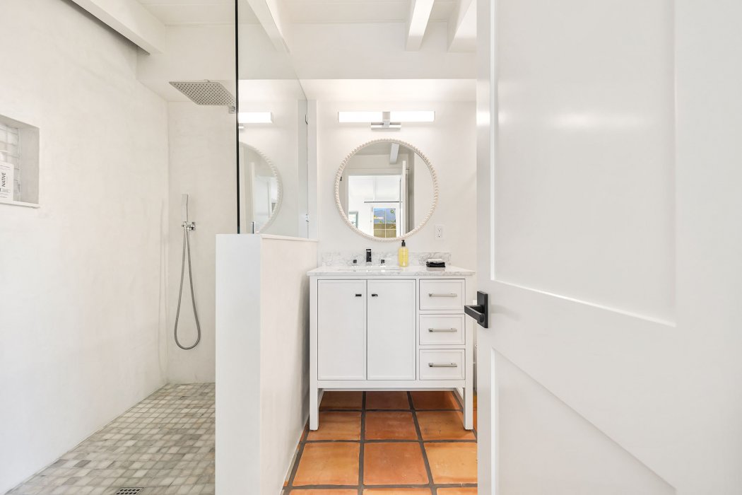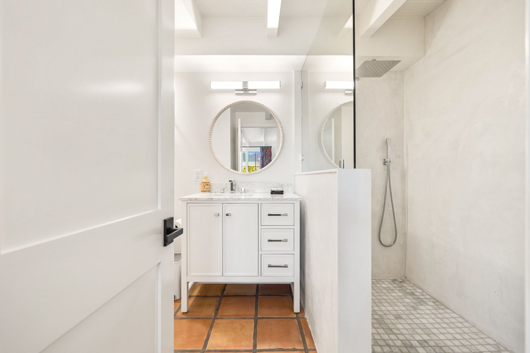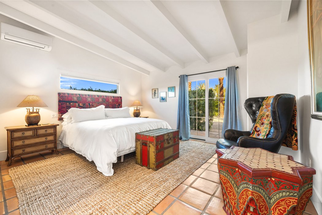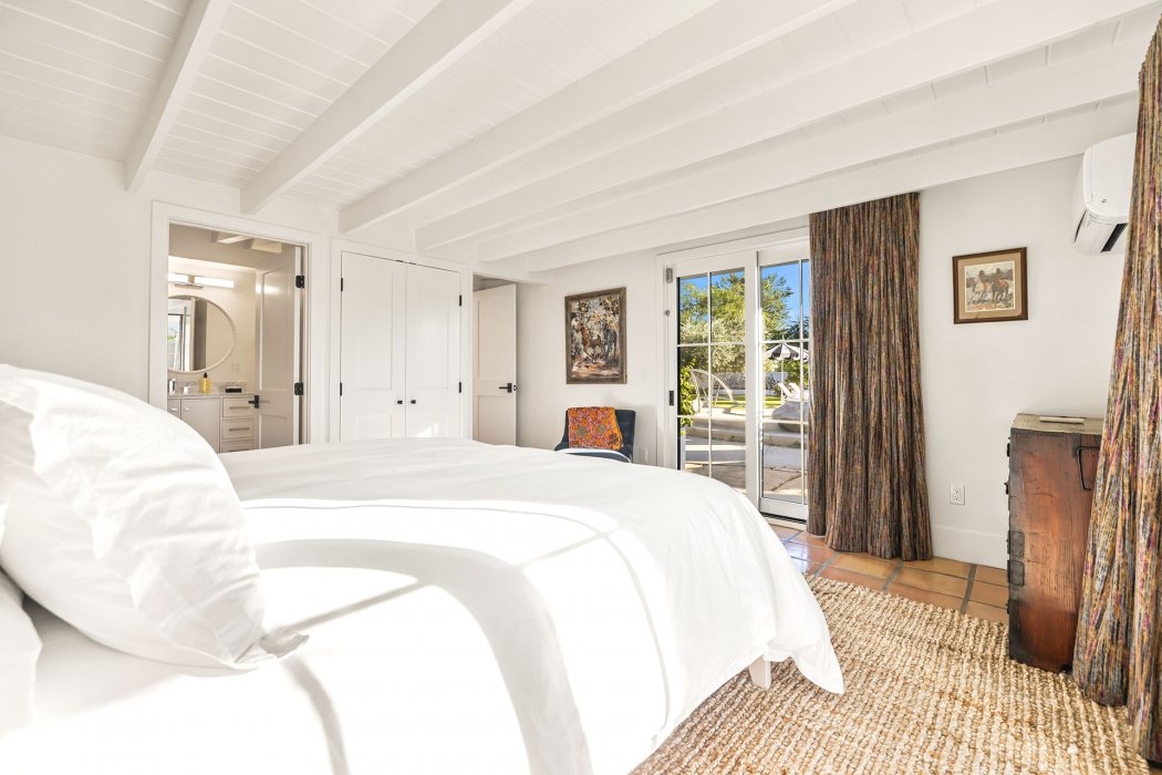 The Primary Suite in the main house features a plush King bed, private doors opening directly to the pool, a TV, and an en suite bathroom with a walk-in shower.