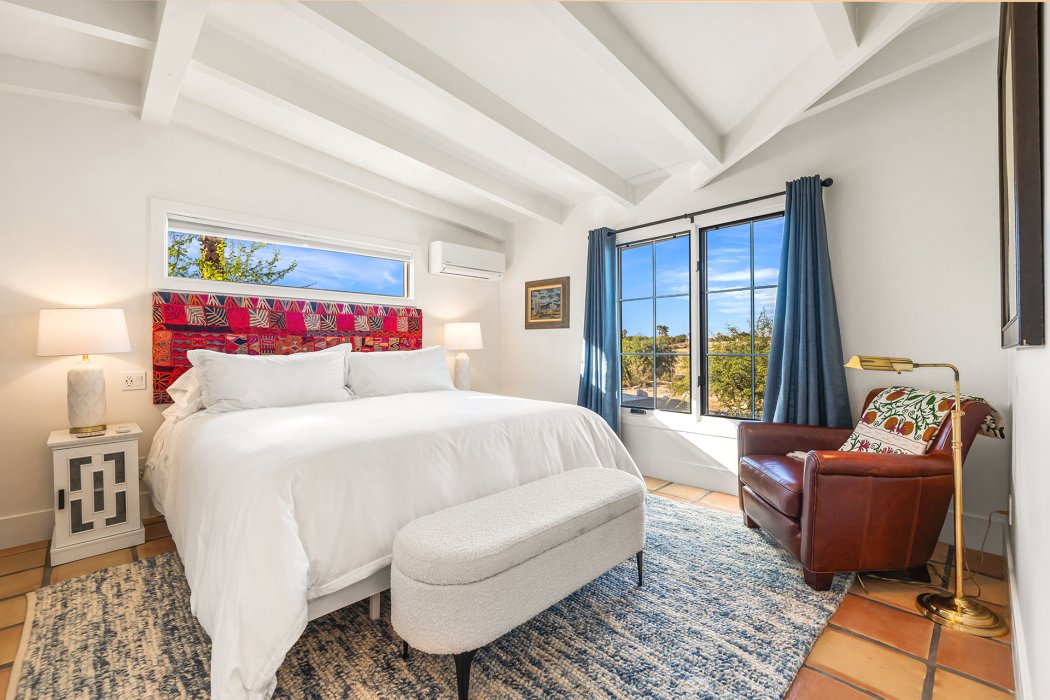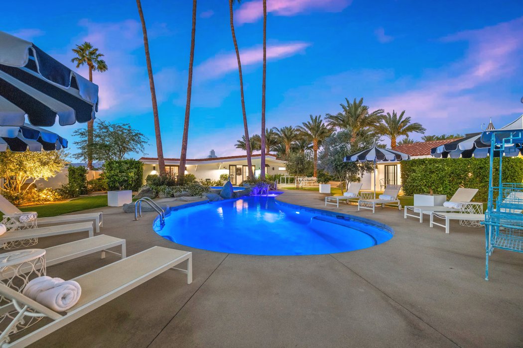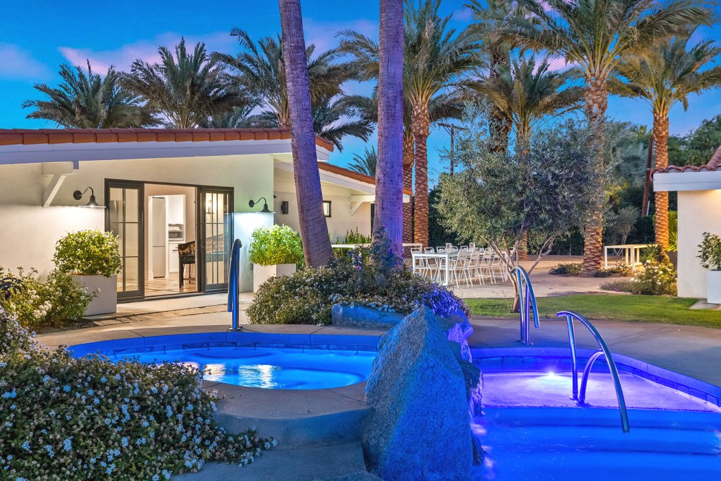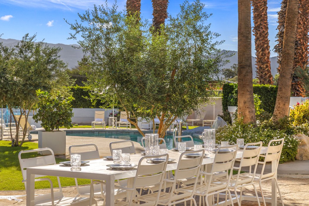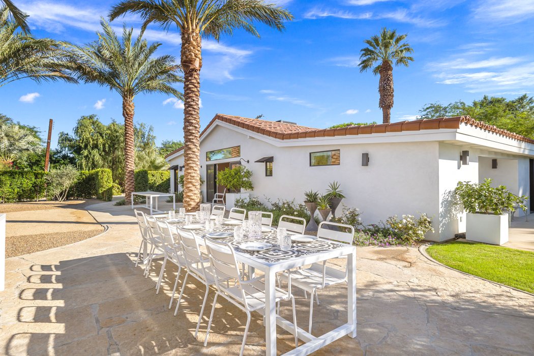 Inside, Desert Dreams Ranch blends classic California ranch style with modern luxury. The elegant 2,500 sq ft main house offers airy, open living spaces filled with natural light, while the adjacent five-bedroom guest house includes its own central living room and kitchenette - perfect for large groups desiring both connection and privacy. The main house has a fully equipped gourmet kitchen, spacious living room with fireplace, wet bar, and dining table seats for 12, with an additional 4 seats at the kitchen bar. Designer finishes, high-end furnishings, and thoughtful details throughout the home create an inviting, resort-like atmosphere.