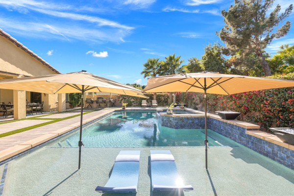 Welcome to Mosaic, a 4 bedroom 3.5 bath desert retreat designed for relaxing in the sun! Outdoors you’ll enjoy a sparkling pool and spa with dramatic fire and water features, BBQ island with seating, multiple firepit lounges, outdoor dining and seating, mature palms with twinkling lights, and sweeping mountain views. Inside, the home features an open concept floorplan with fully equipped kitchen, great room, dining room, media room and comfortable bedrooms. Situated on a generous quarter acre lot, and walking distance to the Coachella Festival grounds, Mosaic offers privacy, elegance, and effortless indoor-outdoor living.