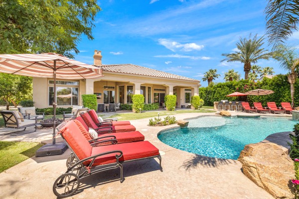 Tropicale at PGA is a beautiful 5 bedroom, 4.5 bath villa overlooking the Weiskopf course. The outdoors features a saltwater pool with tanning shelf and in-pool seating, spa, firepit, BBQ island, al fresco dining and covered outdoor living room with TV. The 4400 square foot interior has a spacious great room with gas fireplace, wet bar and pool table, a fully equipped kitchen, and 5 comfortable bedrooms. It's the perfect place to enjoy all the desert has to offer!